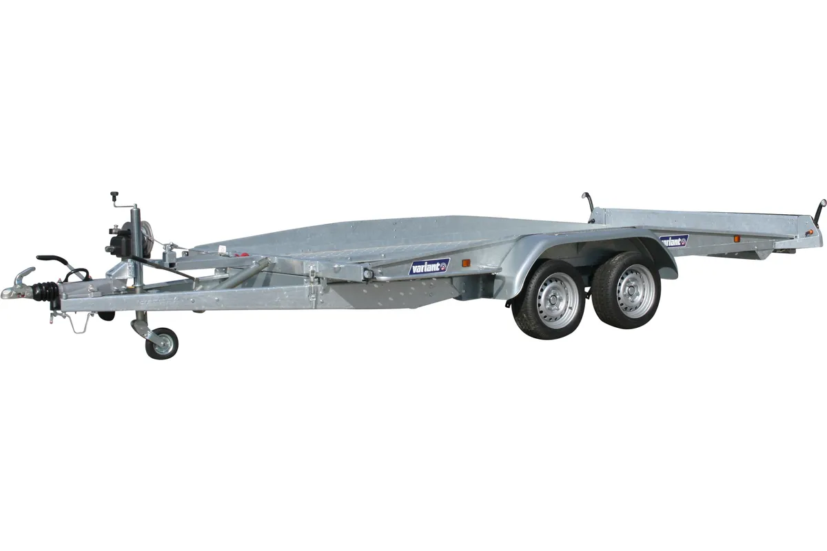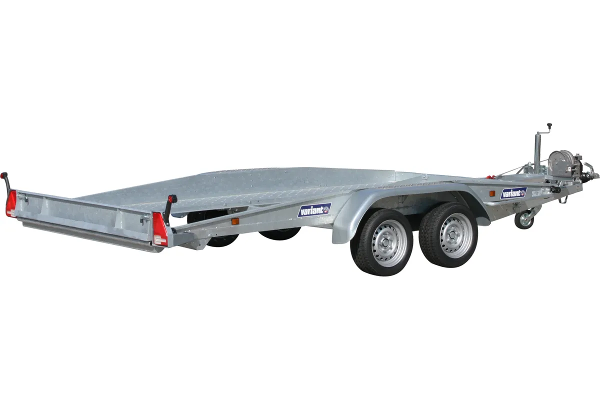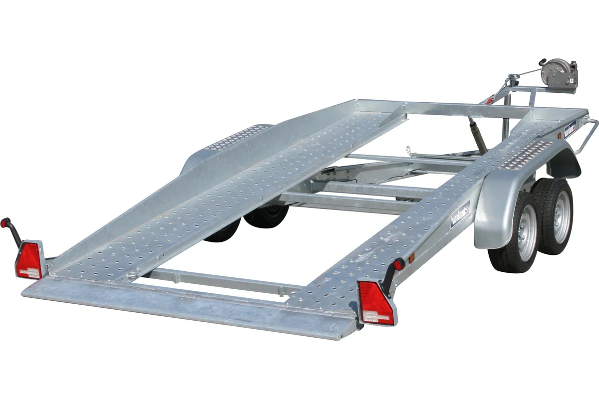 Robuster Autotransportanhänger mit 2700 kg zul. Gesamtgewicht, LED-Beleuchtung, Seilwinde und feuerverzinkter Stahlkonstruktion.