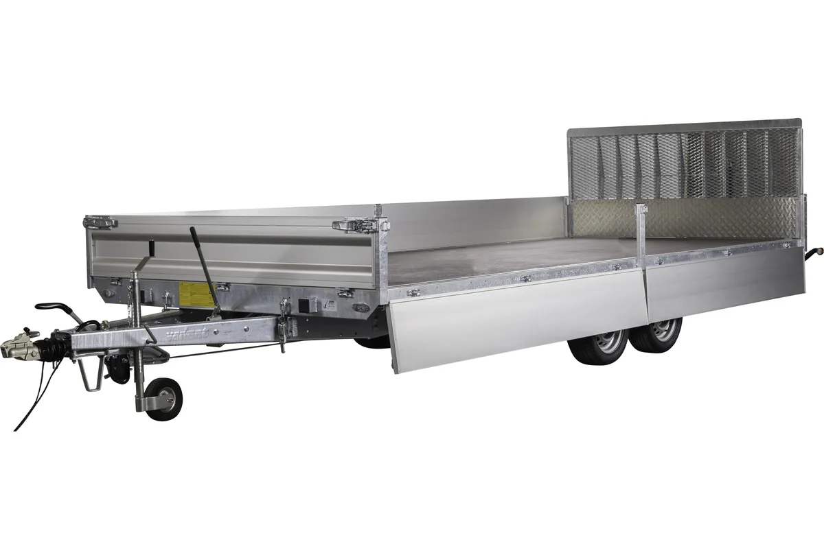 Der Anhänger ist mit einer manuellen Kippfunktion ausgestattet, die das Be- und Entladen von Materialien auf Baustellen und im Tiefbau effizient macht. Die vier klappbaren Bordwände ermöglichen den Zugang von allen Seiten und gewährleisten Flexibilität beim Arbeiten mit unterschiedlichen Materialien und Maschinen. Die abnehmbaren Eck- und Mittelrungen bieten die Möglichkeit, die Ladefläche an die jeweilige Aufgabe anzupassen.