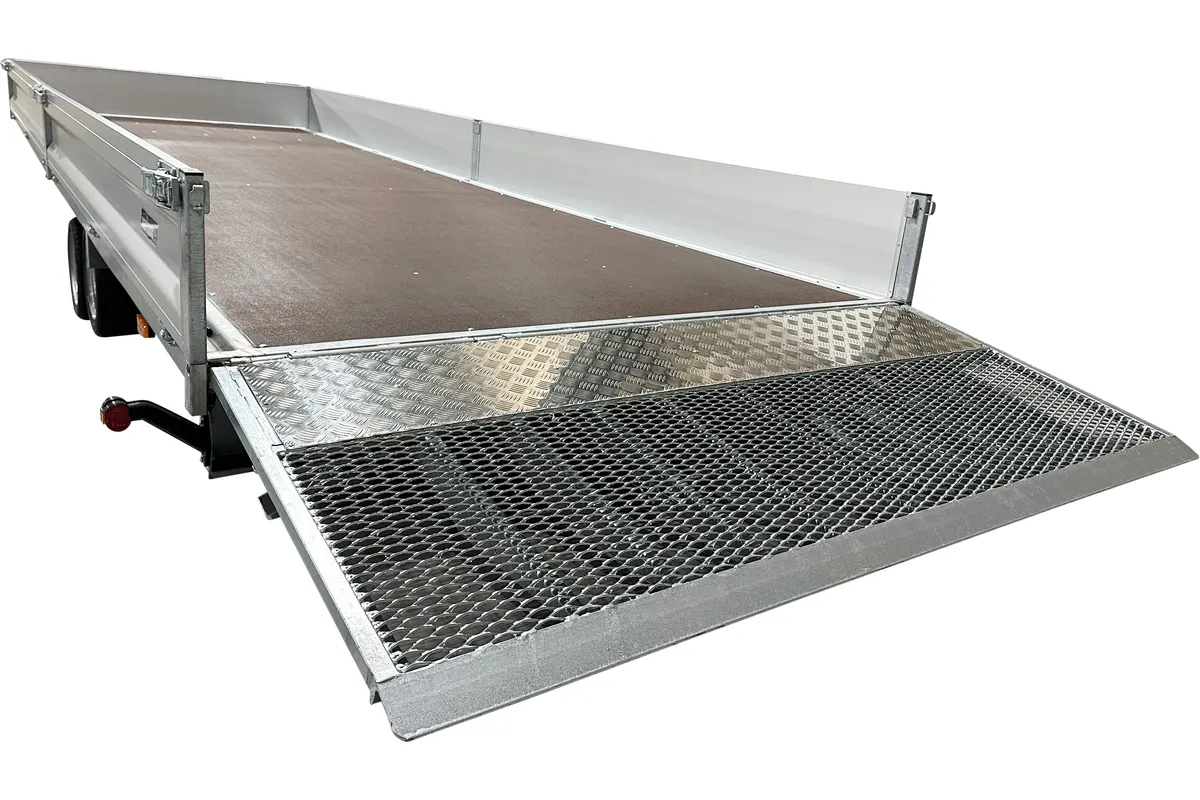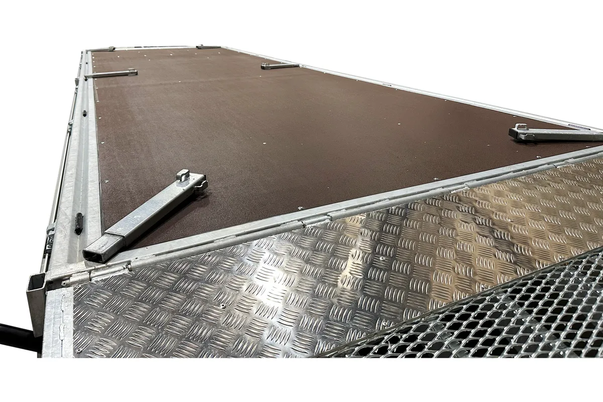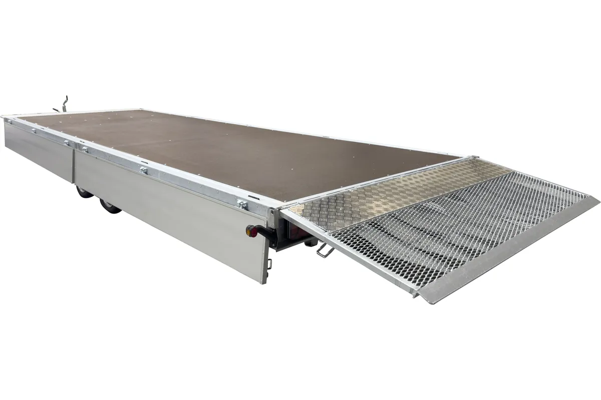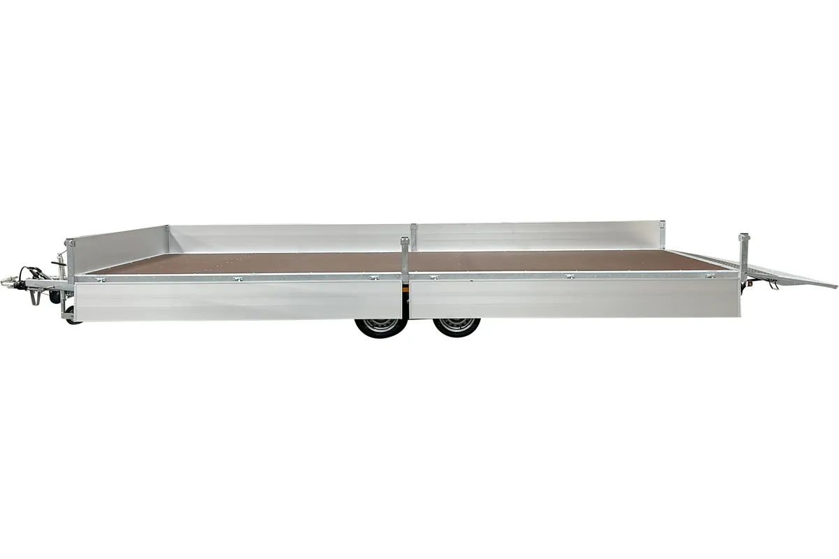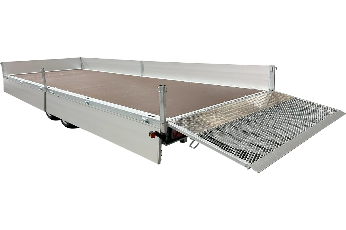 Der Anhänger ist mit zwei Achsen ausgestattet und hat die Räder unter der Ladefläche platziert, was eine optimale Ausnutzung der Ladefläche ermöglicht. Die vier aufklappbaren Aluminium-Bordwände erlauben flexibles Be- und Entladen aus allen Richtungen, was bei unterschiedlichen Einsätzen auf der Baustelle praktisch ist. Die abnehmbaren Rungen an Ecken und in der Mitte ermöglichen eine Anpassung des Anhängers je nach Bedarf.